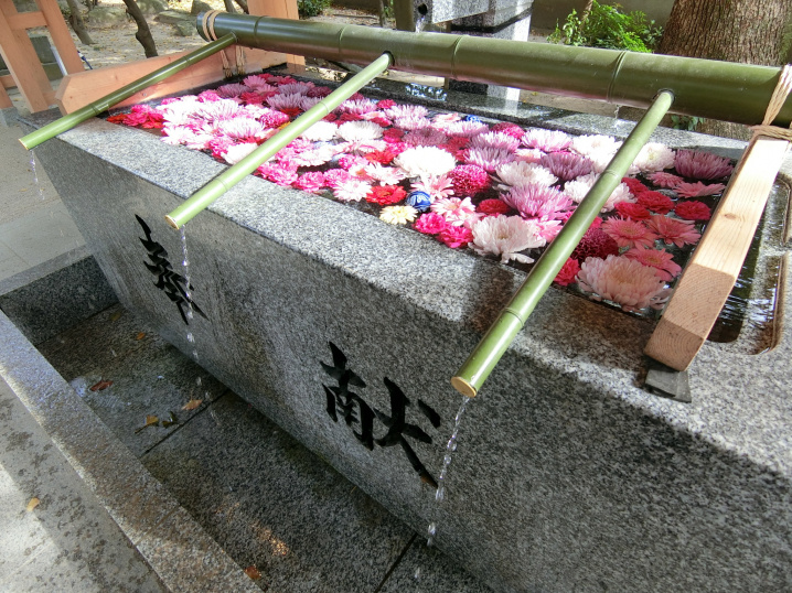 この神社は、仕事運や恋愛運などが上昇するようです。平日にも関わらず、多くの人で賑わっていました。手水花は色とりどりで非常に綺麗でした。ほかの神社ない魅力が溢れていました。この手水花はインスタグラムにも多く投稿されています。
