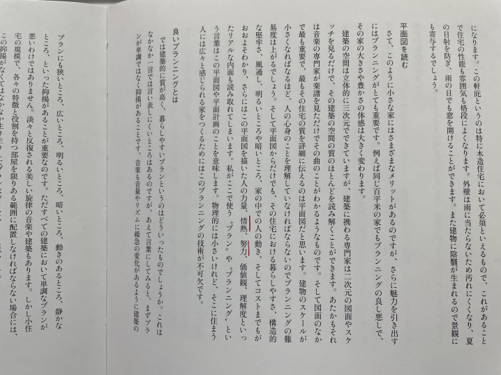 建築の空間は立体的に三次元でできていますが、建築に携わる専門家は二次元の図面やスケッチを見るだけで、その建築の空間の質のほとんどを読み解くことができます。あたかもそれは音楽の専門家が楽譜を見ただけでその曲のことがわかるようなものです。そして図面のなかで最も重要で、最もその住宅の質を詳細に伝えるのは平面図だと思います。建物のスケールが小さくなればなるほど、人の心身のことを理解していなければならないのでプランニングの難易度は上がるでしょう。そして平面図からだけでも、その住宅における暮らしやすさ、構造的な堅牢さ、風通し、明るいところや暗いところ、家の中での人の動き、そしてコストまでがおおよそわかり、さらにはこの平面図を書いた人の力量、情熱、努力、価値観、理解度といったリアルな内面も読み取れてしまいます。私がここで使う”プラン‘“や”プランニング“という言葉はこの平面図や平面計画のことを意味します。物理的には小さいけれど、そこに住まう人には広々と感じられる家をつくるためにはこのプランニングの技術が不可欠です。