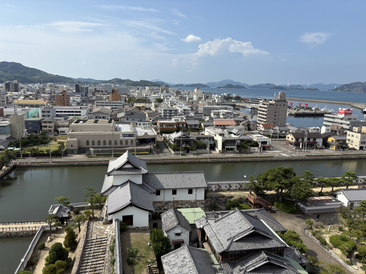 先進的な設計であり、天守最上階からは瀬戸内海の絶景を楽しめる点も魅力です。 とあります。